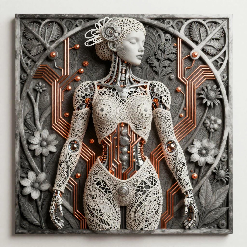 Inspired by the works of Charles Rennie Mackintosh, an androgynous android adorned with lace-like monochrome ink filigree interlaced with glowing copper circuitry, illustrating the seamless connection between nature and technology in a captivating art nouveau style.