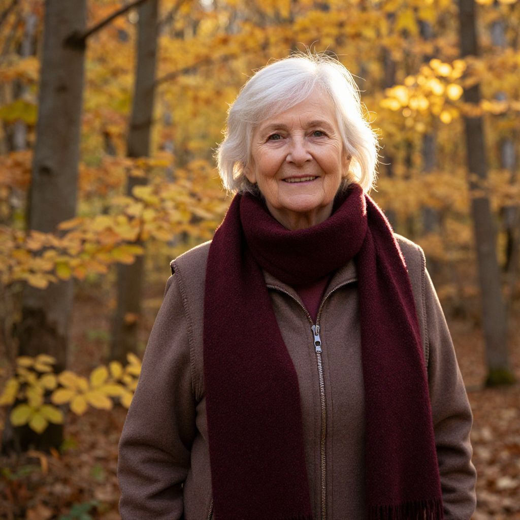 Photograph of an elderly woman with white hair, smiling, wearing a brown jacket and dark scarf, standing in an autumn forest with golden leaves.