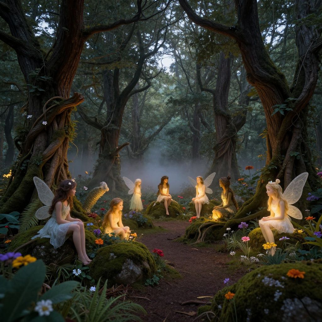 Woodland mythical creatures gathering in an enchanted forest clearing at twilight, soft glowing lights illuminating whimsical fairies, elegant dryads entwined with ancient trees, subtle mist rolling over moss-covered rocks, vibrant flora surrounding the mystical scene.