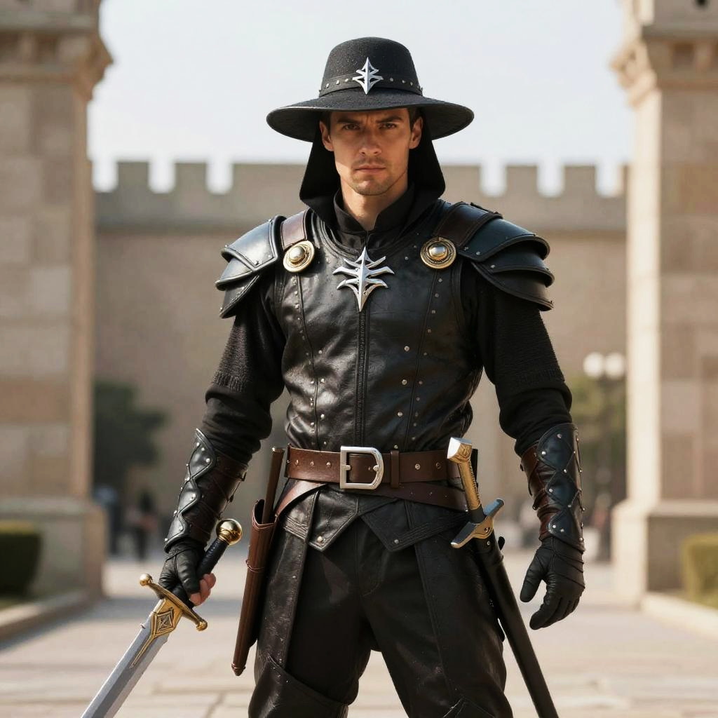 Portrait of an Asian man dressed in a dark blue historical warrior costume with gold accents, wearing a wide-brimmed hat and holding a longsword. The outfit includes leather and metal shoulder armor, arm guards, and a leather belt with decorative buckles. The background is plain gray.