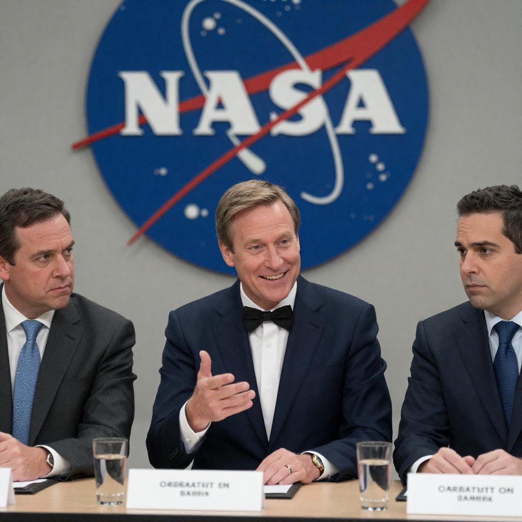Photograph of three men in suits seated at a table with clear glasses, name cards in front. Center man, with light brown hair and bow tie, gestures with right hand, smiling. Left man, dark-haired, serious expression. Right man, dark-haired, neutral expression. NASA in background.