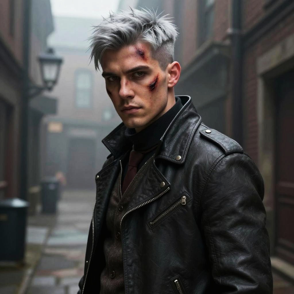 28 year old assassin, asymmetrical silver undercut, Appearance handsome, scarred, tan skin, determined expression, intense brown eyes, detailed, atmospheric color washes, victorian foggy alleyway, high quality