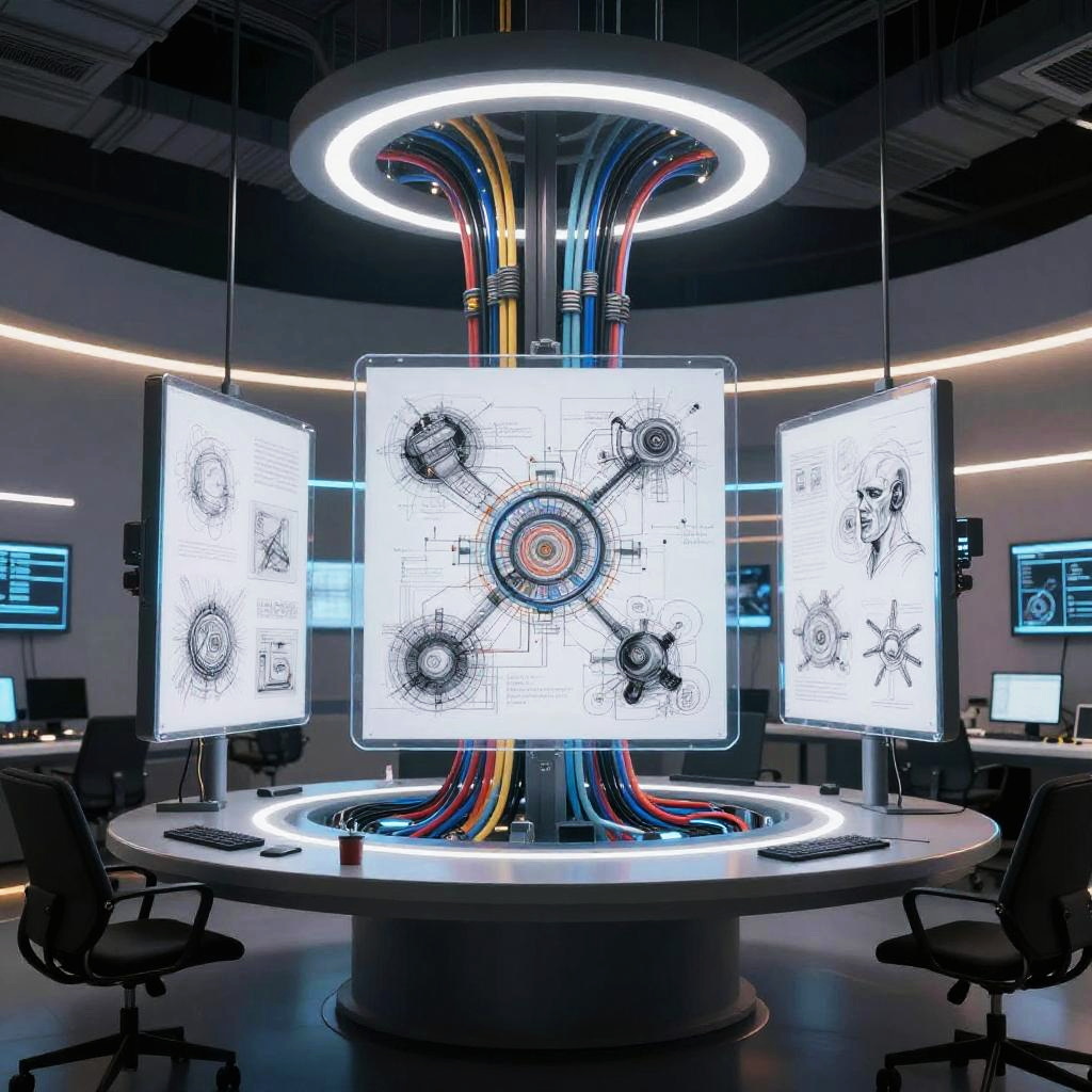 Draw AI generator showcasing an advanced artificial intelligence hub producing stunning artwork, transparent screens displaying evolving sketches, cables and lights integrated into a modern artistic workspace, combination of technology and creativity, cyberpunk-inspired theme