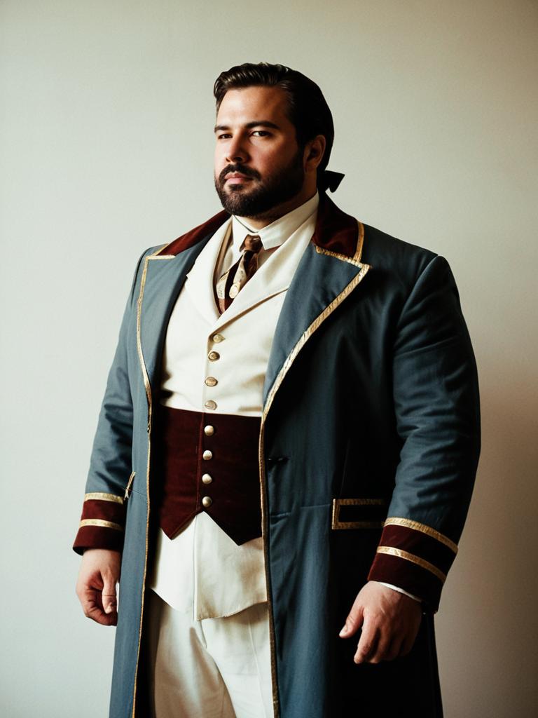 Portrait of a man with dark hair and a beard dressed in The Heavy (Classic) cosplay costume. He wears a long blue coat with gold trim and burgundy cuffs over a white shirt and beige vest, complemented by a burgundy waistcoat with buttons and a tie. The image captures a realistic and detailed portrayal of the costume and character.