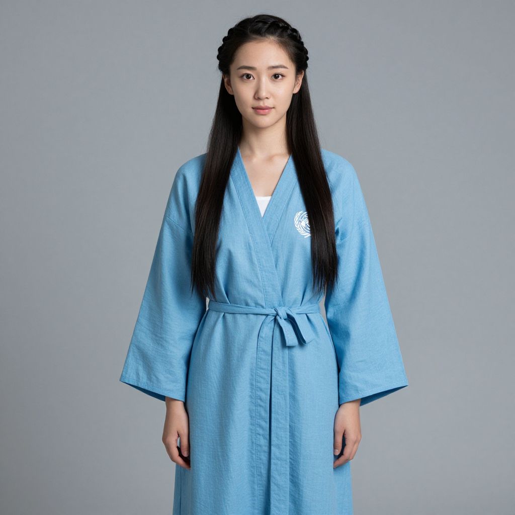 Photograph of an Asian woman with long black braided hair, wearing a light blue kimono-style robe, standing against a plain gray background.