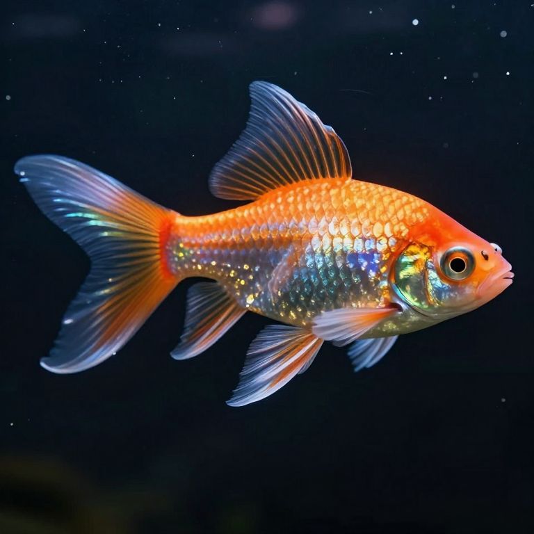 Gleaming glass fish with iridescent orange and silver scales gracefully swims through a dark, ethereal backdrop, its translucent fins shimmering with liquid light that shifts and dances, casting an enchanting glow around its form.