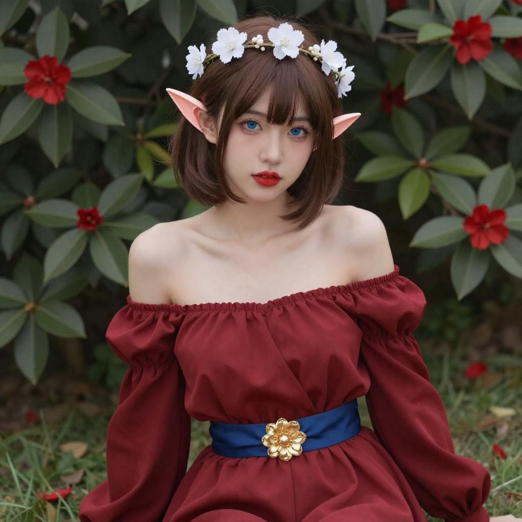 Portrait of a young woman with pointy elf ears, blue eyes, and short brown hair adorned with a delicate white flower crown. She is wearing a deep red off-shoulder dress with long sleeves and a blue sash belt featuring a gold flower brooch. The woman has a natural makeup look with vivid red lipstick and sits against a backdrop of lush green foliage and red flowers, emphasizing a fantasy or cosplay theme.