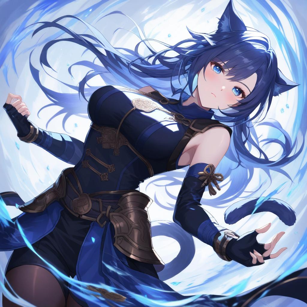Monk (final fantasy), final fantasy, 1girl, cat ears, cat tail, blue eyes, short hair, long hair, fingerless gloves, miqo'te, by artist rin yuu, animagine