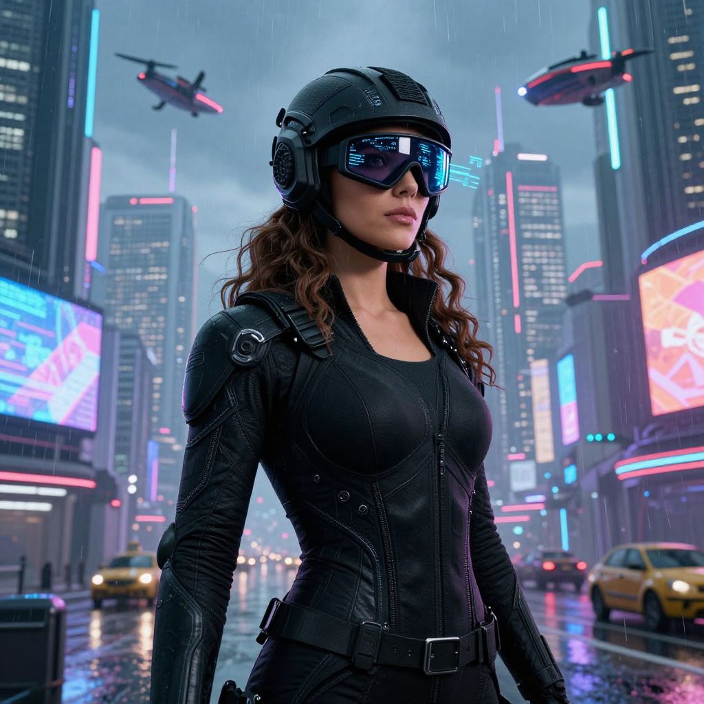 A woman with rich, wavy brown hair, wearing a sleek black tactical outfit made of high-tech, form-fitting materials, a sturdy, aerodynamic helmet with embedded HUD displays, and advanced protective goggles that glow faintly with blue data streams, stands confidently in the heart of a sprawling futuristic cityscape. The backdrop features towering neon-lit skyscrapers, flying vehicles gliding through the sky like drones and hovercrafts, and a vibrant cyberpunk atmosphere filled with holographic ads, rain-slicked streets, and shimmering digital reflections. Her expression is focused and determined, with a subtle hint of mystery in her eyes—calm yet intense—as she looks ahead with unwavering resolve. The scene blends urban grit with cutting-edge technology, evoking a world where humanity and machines coexist in a dynamic, high-stakes future.