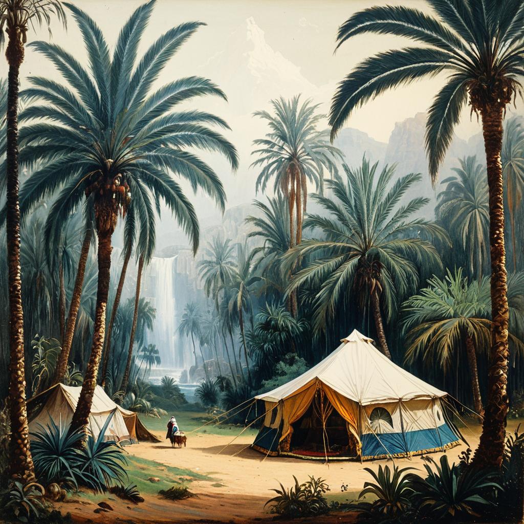 A detailed painting depicting a peaceful desert oasis featuring two canvas tents surrounded by tall date palm trees and dense tropical vegetation. Mist rises gently in the background with rugged mountains providing a dramatic backdrop. The scene evokes a symbolist and folkloric style reminiscent of Gustave Moreau and James McNeill Whistler, blending tropical, Bamileke, and folkloric artistic elements.