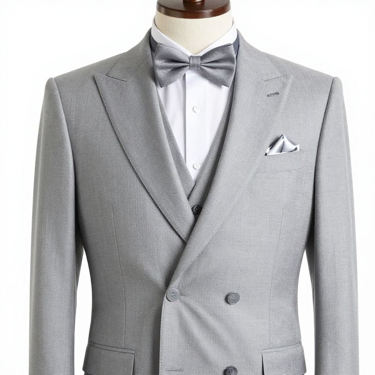 Custom-made light grey men's suit displayed on a mannequin, featuring a double-breasted vest, slim fit design, and tailored wedding tuxedo ensemble with a white shirt, gray bow tie, and pocket square.