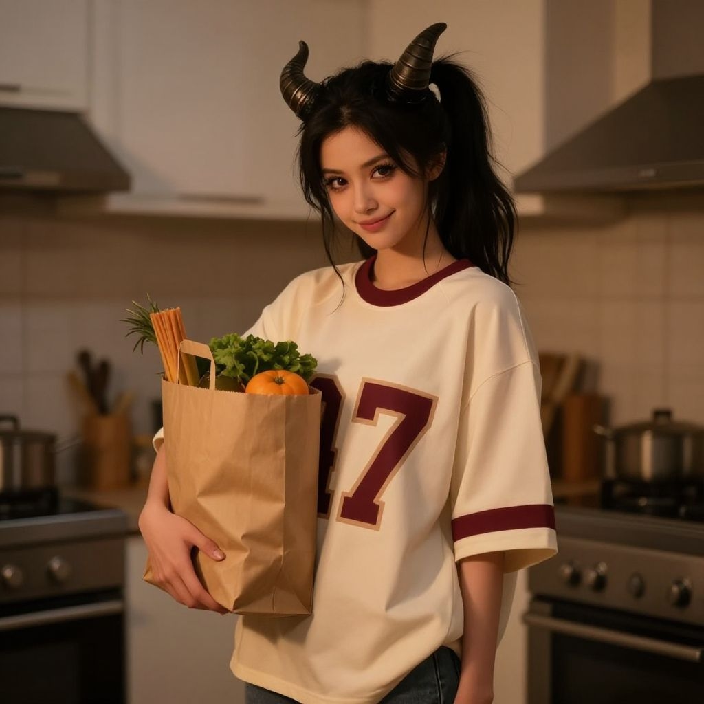 Masterpiece, (7:00 pm) overcast, dusk, amber glow, Rembrandt lighting, photorealistic, sharp focus, from a standing position, 1girl, 26-year-old succubus, (cute: 1.5) (petite: 1.3), black hair, (bushy ponytail: 1.3), (small horns: 1.3), (tiny body: 1.5) (160cm height: 1.5) (small breasts: 1.5) With Thick Eyelashes, small mouth, (realistic skin texture: 1.5), dark hazel eyes, (extremely delicate: 1.3), in the kitchen, with a (brown paper bag) of groceries, wearing a (large, oversized, boxy (cream-colored jersey-style t-shirt: 1.5) with a (burgundy stripe encircling the sleeves) and a (number 47 ) on the front) with jeans. (sly, teasing smile)