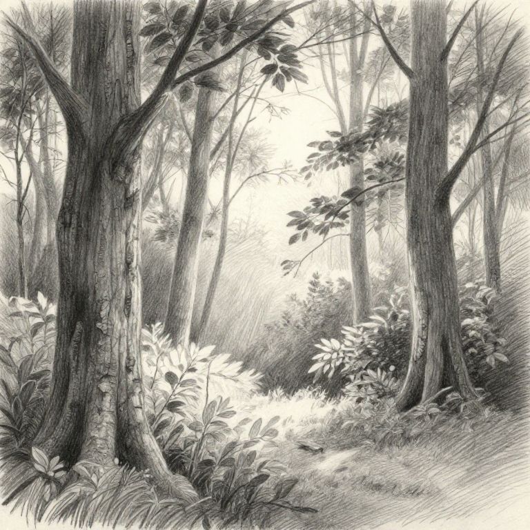 Drawing photo reference depicting a serene forest scene with detailed textures of tree bark and leaves, soft sunlight filtering through branches, realistic shading techniques to capture depth and atmosphere in pencil sketch style