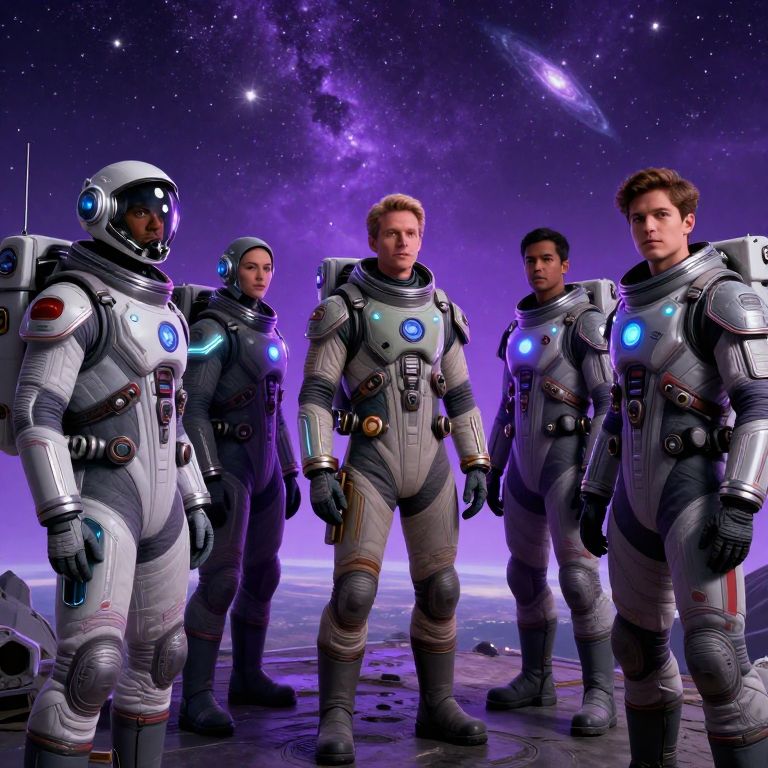 Members of a futuristic space exploration team gathered on an alien planet, wearing advanced suits with glowing accents, intricate technology all around, under a vibrant purple sky filled with stars and distant galaxies, ultra-detailed sci-fi style.