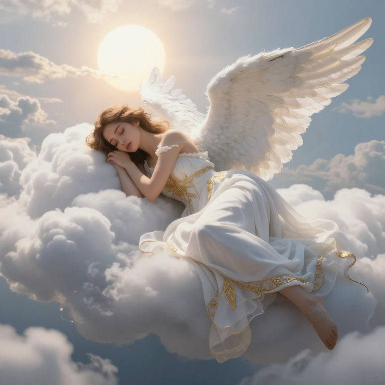 Digital artwork of a sleeping angel with white wings and golden-trimmed white dress, lying on a fluffy cloud against a bright sunlit sky.