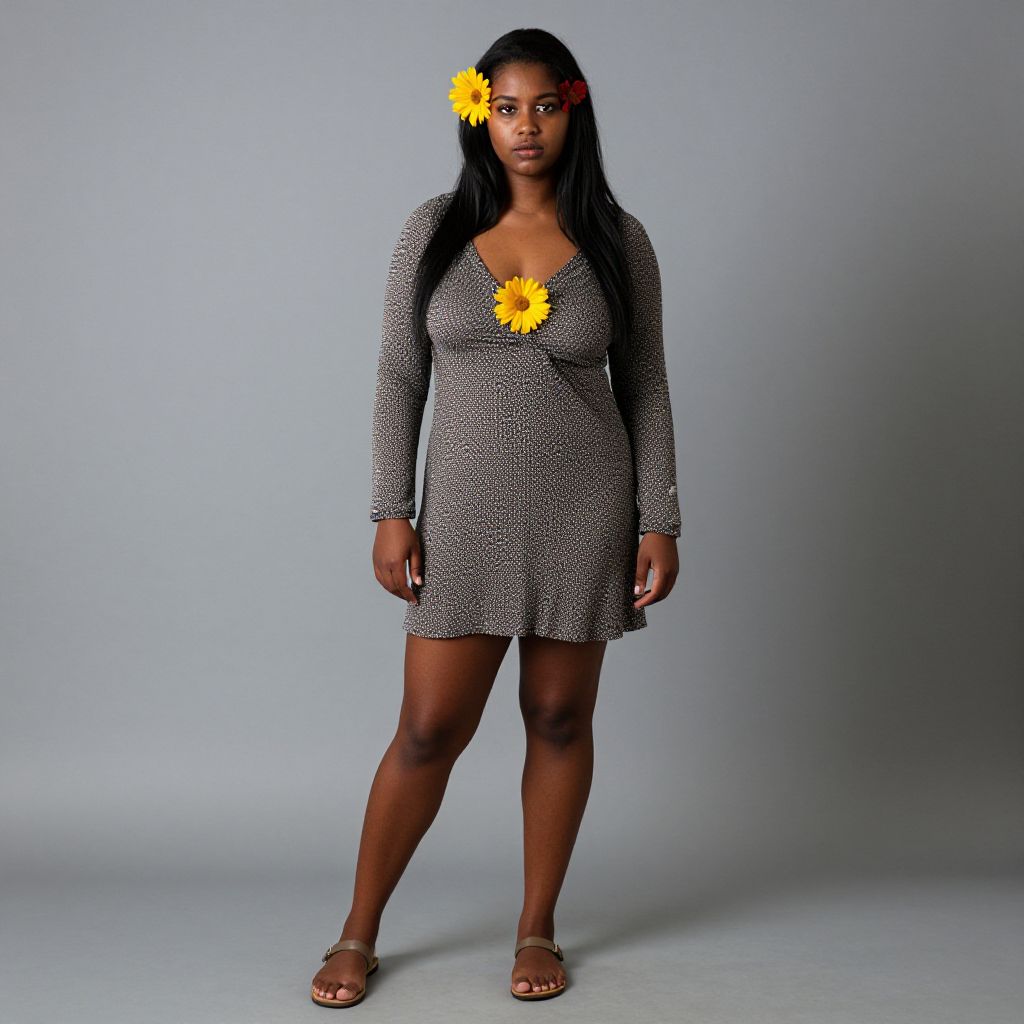"plus size flower child woman, solo, flower, 1boy, black hair, standing, male focus, full body, looking at viewer, simple background, sandals, dark skin, dress, grey background, long sleeves, yellow flower, red flower Realistic photo of casual sexy person with pretty face"