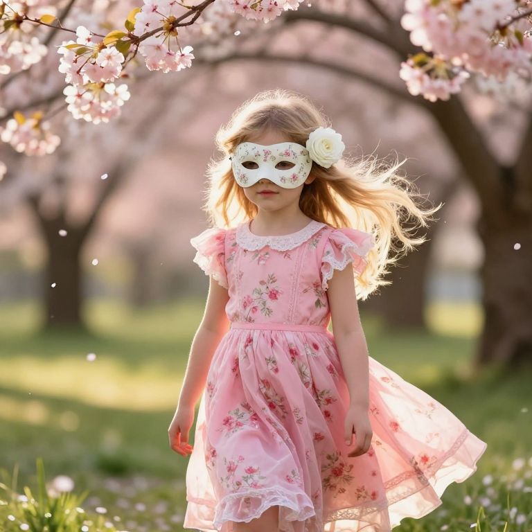 A beautiful young girl with soft, sun-kissed blonde hair flowing gently in the breeze, wearing a vibrant pink floral dress that billows around her like a whisper of spring, adorned with delicate lace trim and subtle ruffles. A delicate porcelain mask covers her face, etched with intricate floral patterns that catch the light like petals in sunlight. A fresh white rose is tucked neatly into her hair, its petals slightly damp from the morning dew. She stands in a sun-drenched garden at golden hour, where warm, soft sunlight filters through a canopy of blooming cherry blossoms, their pink and white petals drifting like snow in the gentle wind. The scene is bathed in a dreamy, whimsical atmosphere, with long shadows stretching across the grass, evoking a sense of timeless beauty, innocence, and gentle magic. The overall mood is serene, poetic, and deeply nostalgic, as if the moment has been captured from a fairy tale.