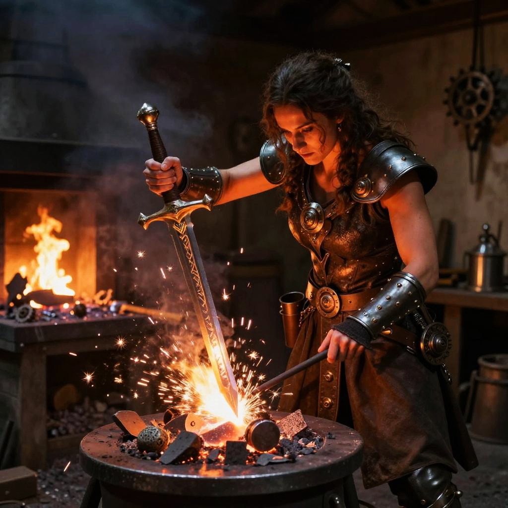 Valentina dwarf blacksmith crafting a glowing magical sword in a rustic forge, sparks flying and warm light reflecting on metal surfaces, muscular but petite figure focused on her work, steampunk fantasy setting with detailed workshop background, dramatic lighting.