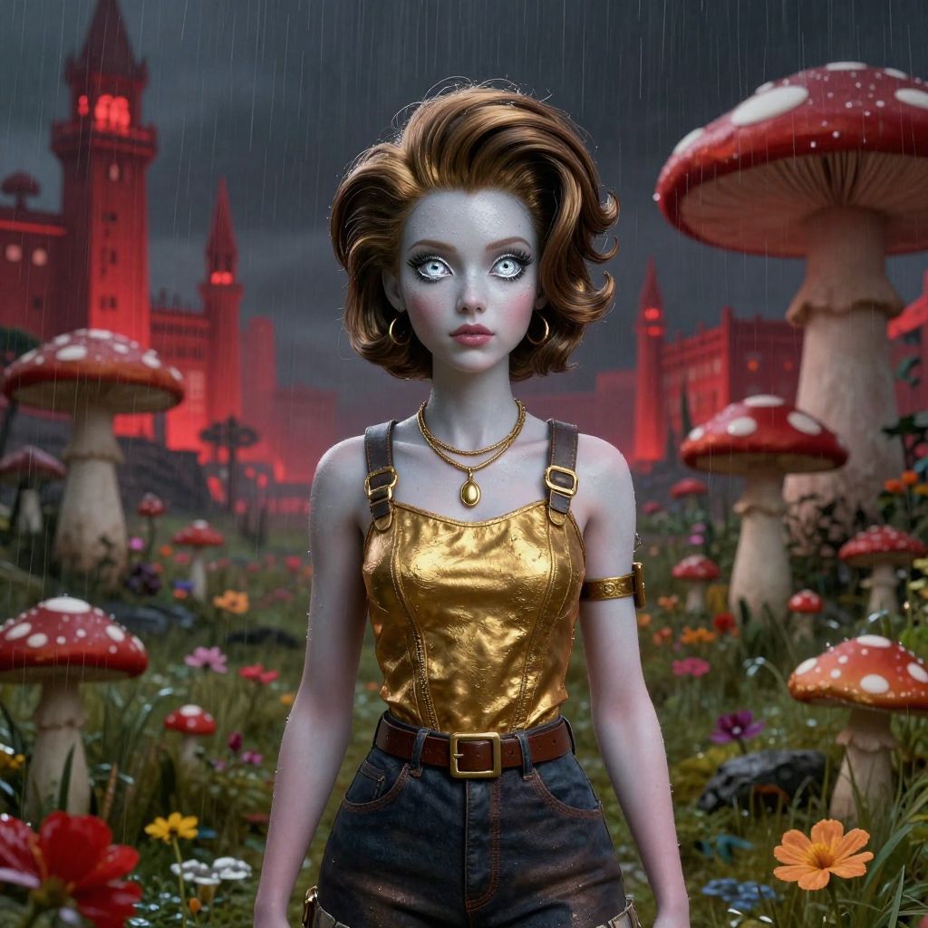A digitally rendered image of a pale-skinned, large-eyed doll with voluminous brown hair, wearing a gold metallic tank top and brown overalls with a gold armlet. She stands in a whimsical, rain-soaked forest filled with oversized red-capped mushrooms and colorful flowers. The background features a dark, stormy sky with red-illuminated Gothic-style towers and buildings. The doll's expression is wide-eyed and slightly surprised. The scene has a fantasy, fairy-tale aesthetic, with vibrant colors and detailed textures.