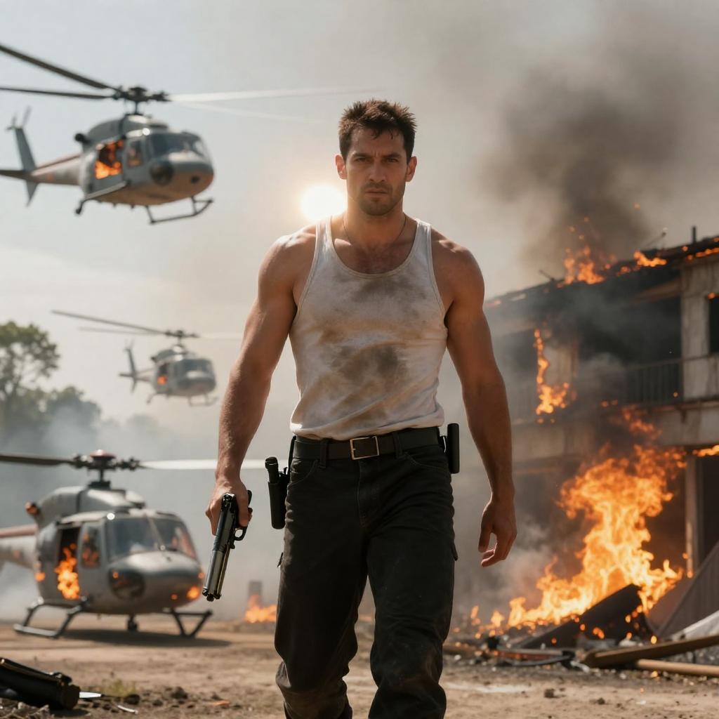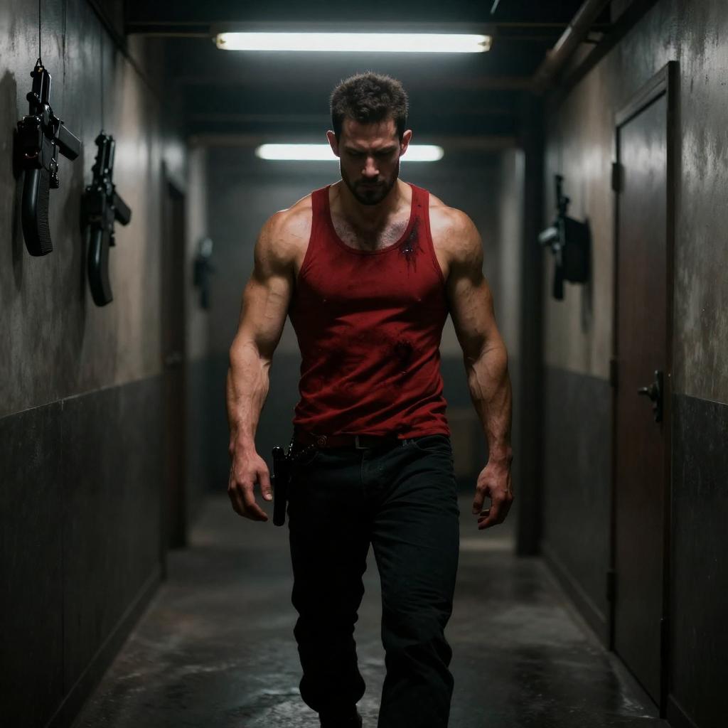 Muscular man with blood-stained red tank top and black pants, intense expression, walking down dimly lit, narrow, industrial hallway. Guns and equipment hang on both sides. Fluorescent lights overhead. Dark background, metallic ures.