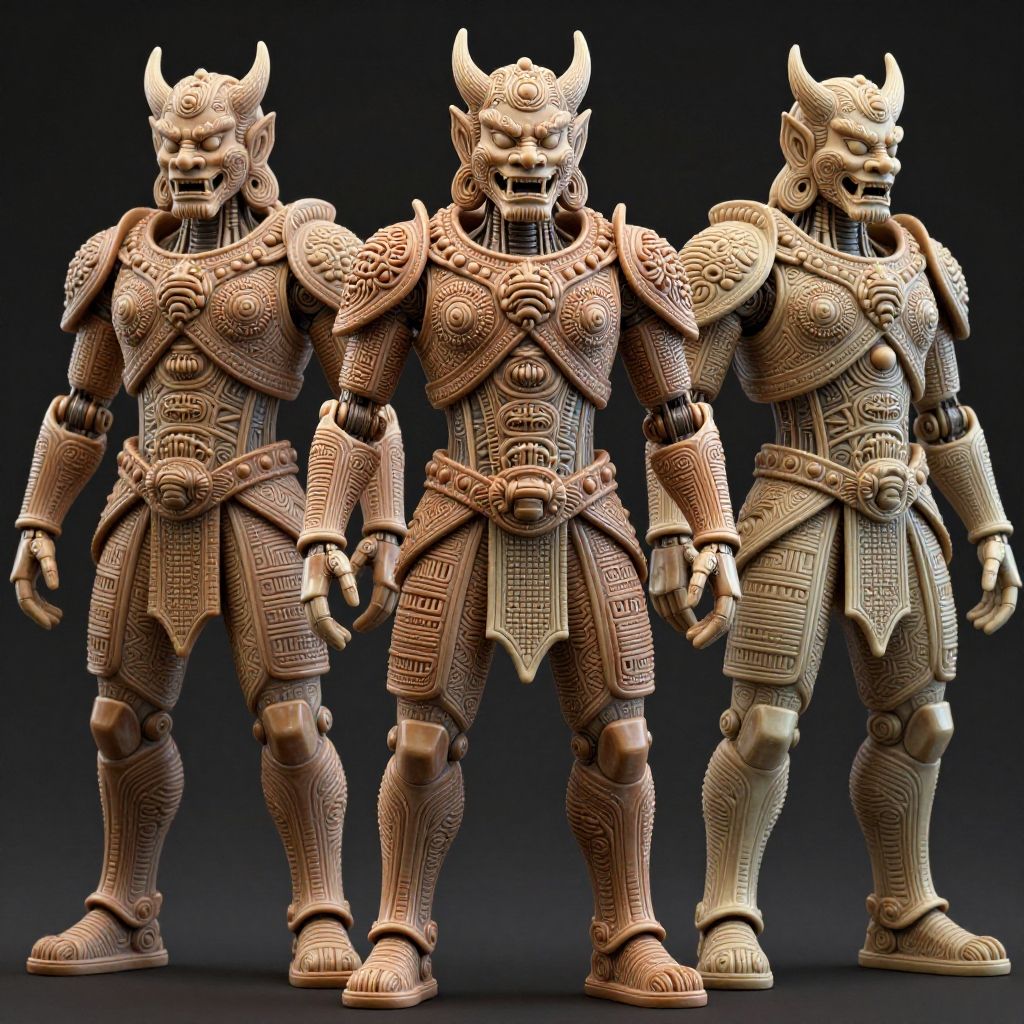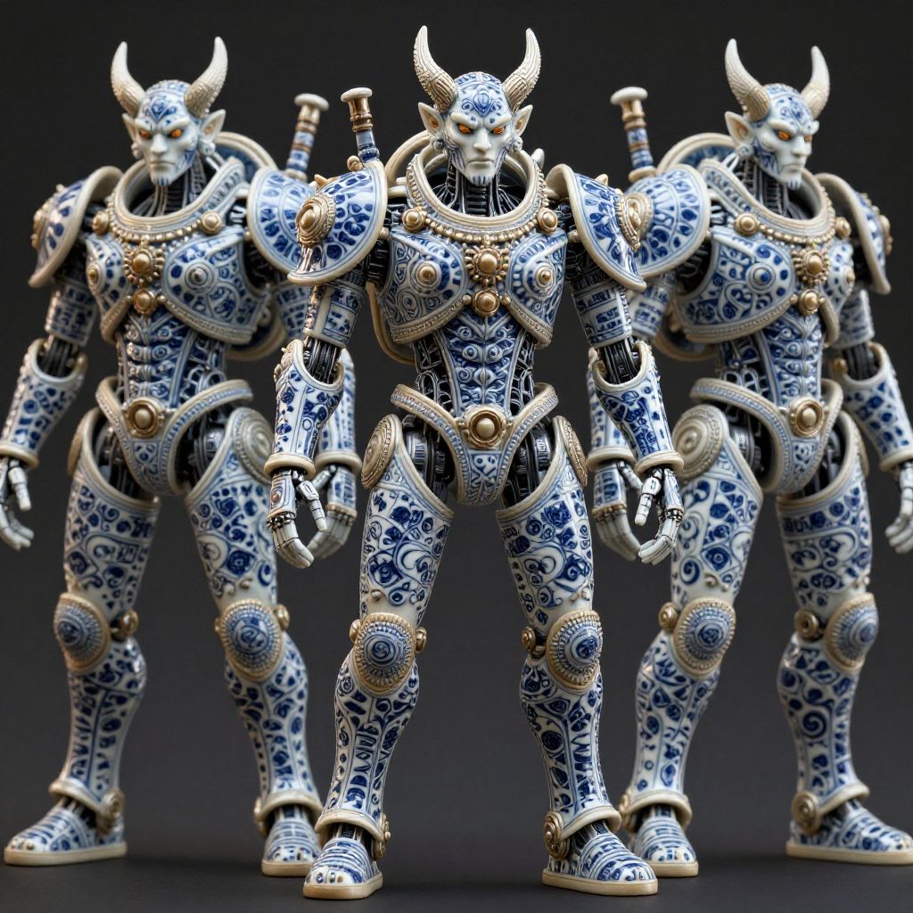 Carved porcelain cyborg demons riding a motorcycle different full body modelposition, high detailed cinematic background, Miki Asai Macro photography, close-up, hyper detailed, trending on artstation, sharp focus, studio photo, intricate details, highly detailed