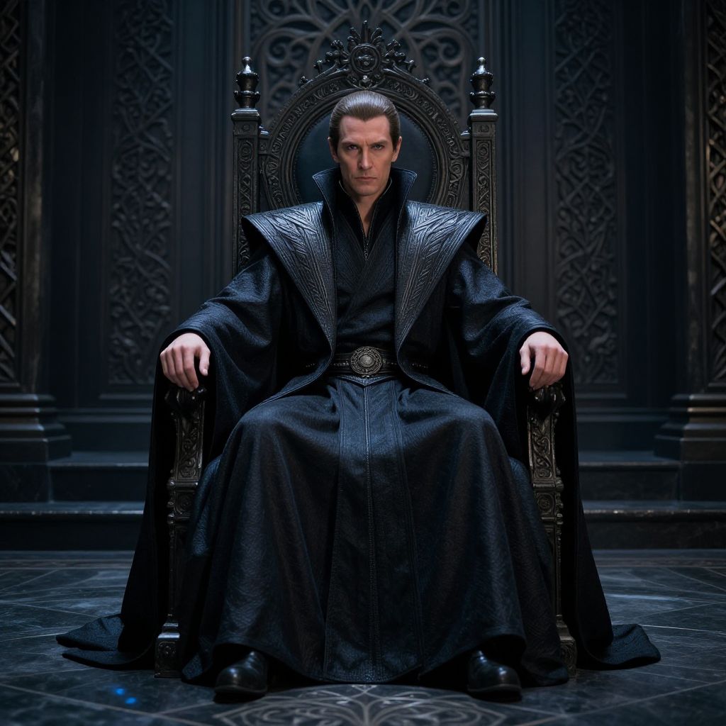 A male figure dressed in elegant dark robes sits authoritatively on an intricately carved ornate throne. The gothic-style hall features elaborate patterns on the walls and floor, creating a cold and commanding atmosphere. The subject's intense expression and realistic textures enhance the powerful and regal mood of the scene.