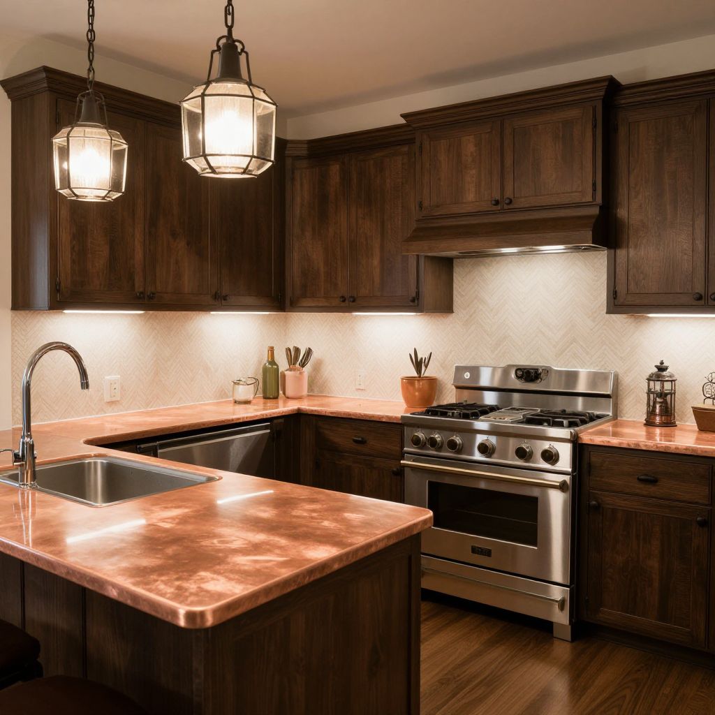 Elegant kitchen island featuring a marble countertop adorned with a vibrant floral arrangement and a fruit bowl, surrounded by dark wooden barstools, illuminated by three hanging lantern-style pendant lights, complemented by white cabinetry and a brick backsplash with a wall clock above the stove.