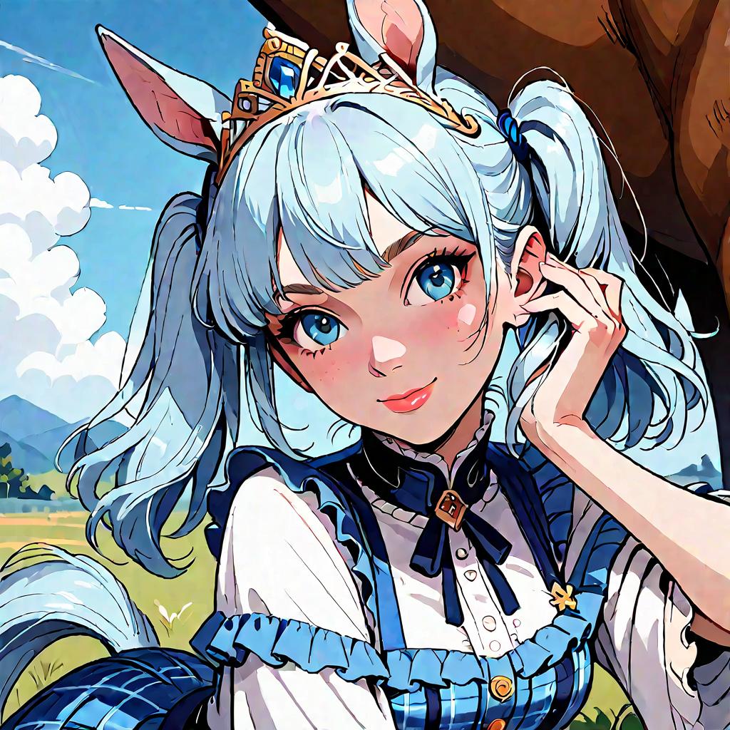 Score_9, score_8_up, score_7_up, source_anime, rating_safe, solo, 1girl, daiwacasual, smile, looking at viewer, hand in own hair, twintails, tiara, horse ears, frills, white shirt, off-shoulder shirt, blue skirt, plaid, horse tail, outdoors