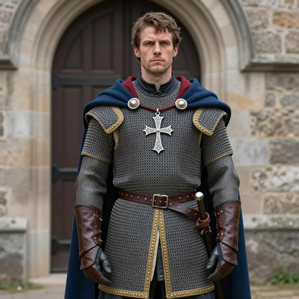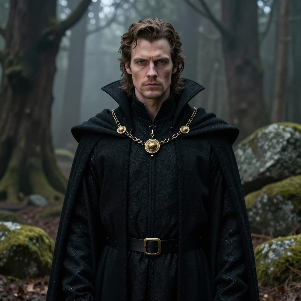Bad guy costume book week, photorealistic, male character, medieval forest, standing, serious expression, short brown hair, light beard, wearing deep red hooded cloak, dark brown leather gloves, black belt with silver buckle, autumn forest background, fallen leaves on ground, trees with yellow and brown leaves, misty atmosphere, dramatic lighting, photo, fantasy genre, adventure, heroic, detailed ures, high contrast, realistic clothing, natural setting