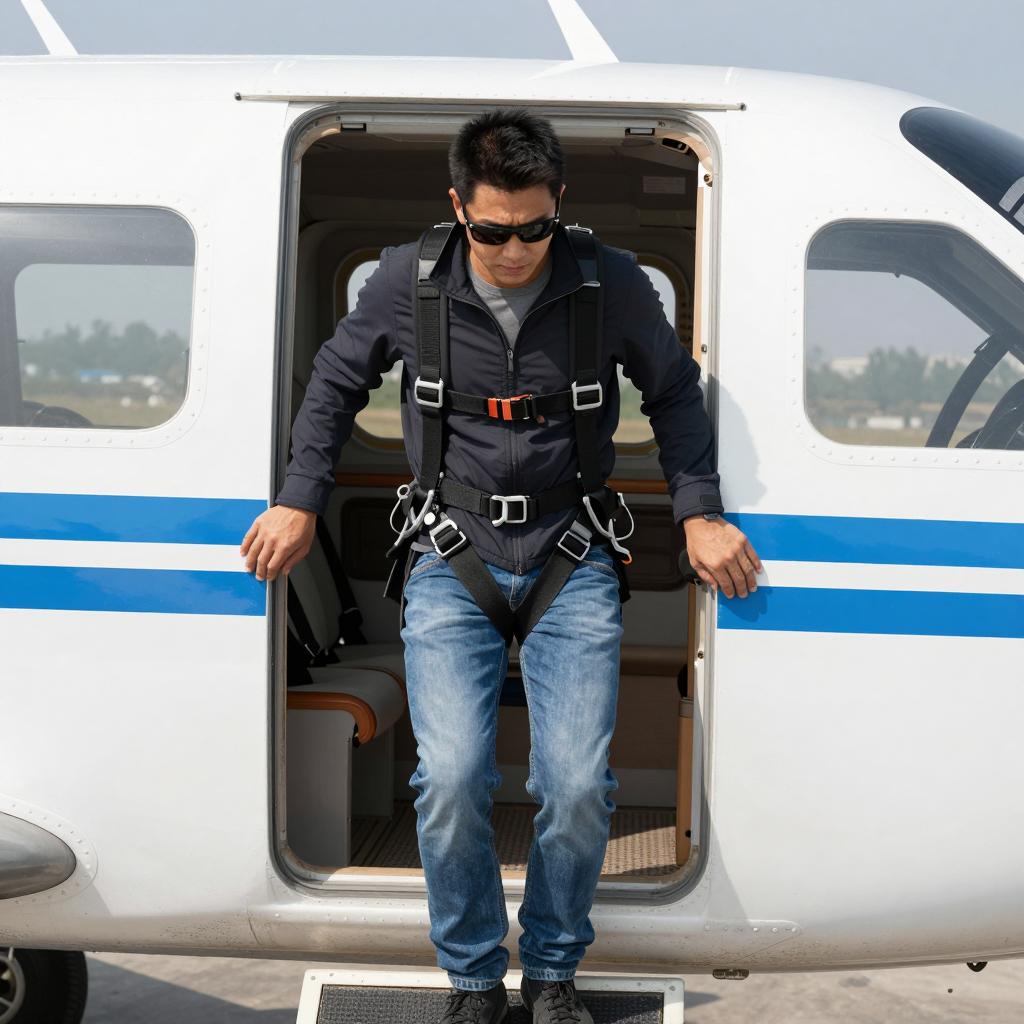 Man with short black hair, wearing sunglasses, dark jacket, gray shirt, blue jeans, and harness, stepping out of small white and blue airplane. Plane door open, man's hands on door frame, backpack straps visible. Bright daylight.