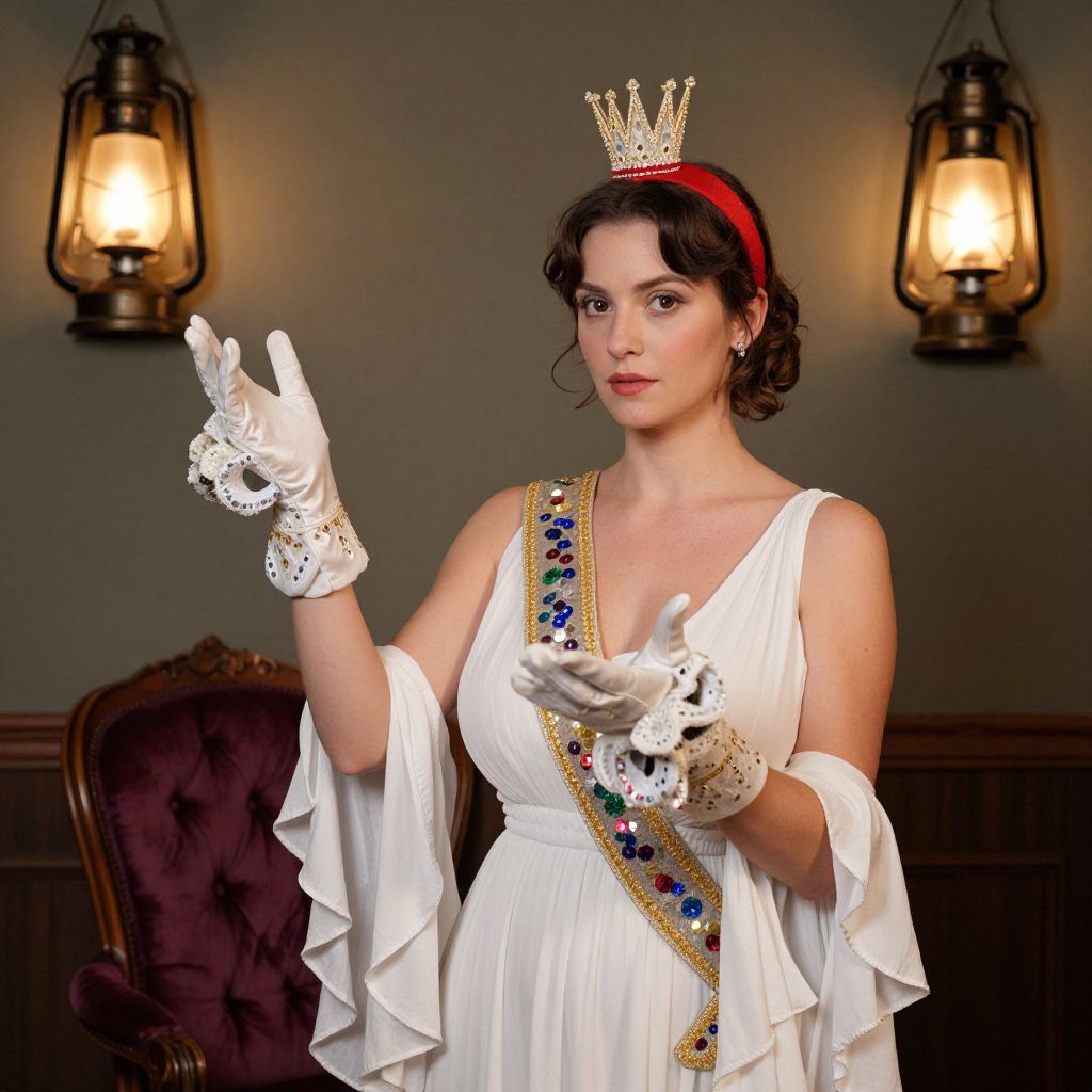 A confident, elegant woman with fair skin, high cheekbones, and soft brown eyes, wearing a vintage magician assistant outfit with a flowing white dress, oversized gloves made of sequined material, a red headpiece with tiny sparkly crowns, and a sparkling sash, performing a small illusion in a cozy, retro-era stage atmosphere with a velvet chair and old-style magic lanterns glowing on the wall.. The woman has big tits and cute face