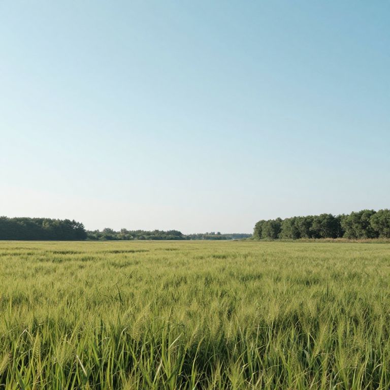 Photograph of a vast, sunlit grassy field with tall, green grass in the foreground. The field extends to a distant treeline on the right, under a clear, bright blue sky. The grass appears lush and healthy, with varying shades of green. The horizon is slightly curved, and the treeline is dense, providing a dark green contrast to the lighter grass. The image captures the serene beauty of a rural landscape on a clear day.