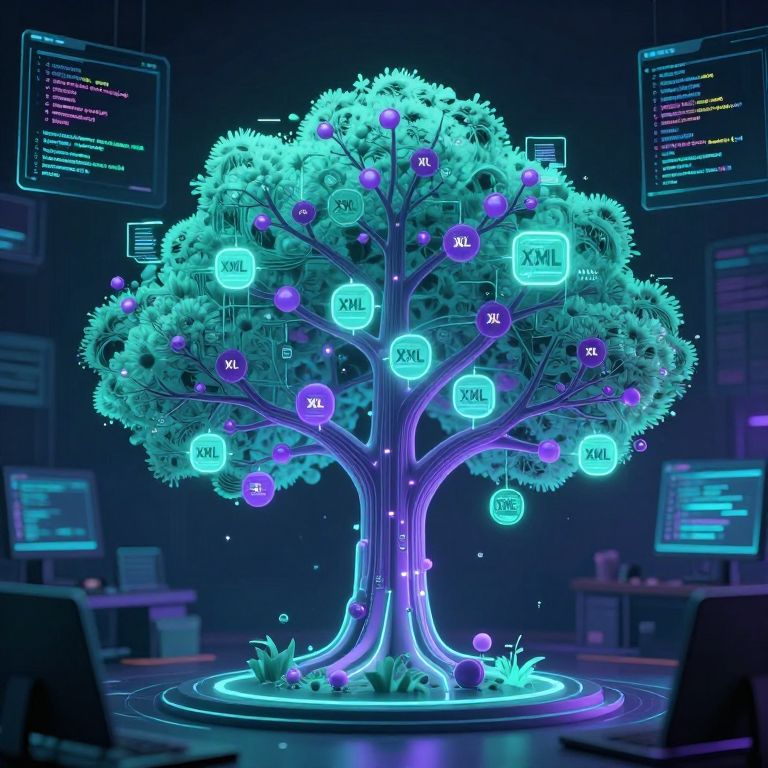 Creative depiction of ElementTree in a cyber workspace, with layers of XML nodes arranged like tree branches, glowing softly in shades of teal and purple, surrounded by holographic data panels and code fragments, reflecting programming complexity.