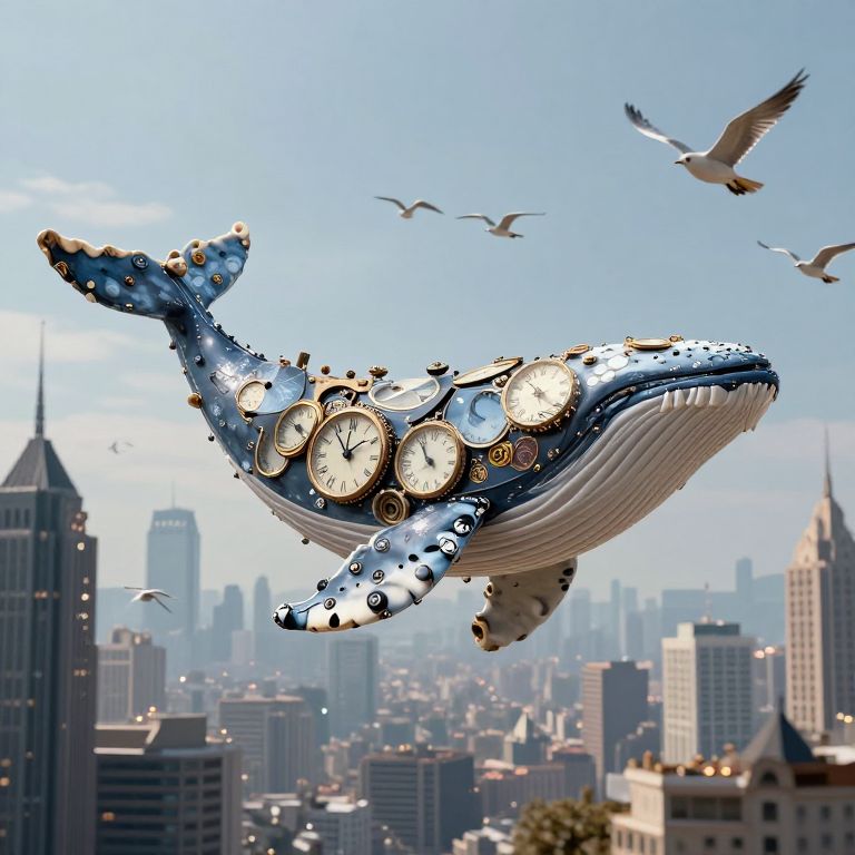 A surreal symphony of time and imagination unfolds as a clockwork whale, adorned with the passage of hours, glides serenely over a cityscape where skyscrapers pulse with the whispers of stories, and birds take flight from the ethereal pages of collective dreams.