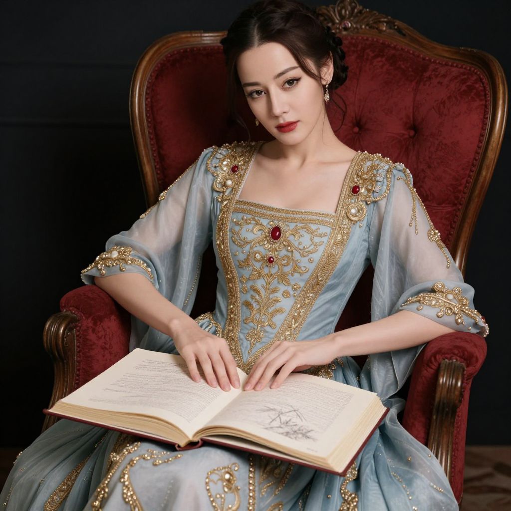 Photograph of an East Asian woman with fair skin and dark hair, seated on a red velvet armchair. She is wearing an ornate, light blue ball gown with gold embroidery on the bodice and skirt. The dress has puffed, gold-trimmed sleeves and a deep V-neck. She is holding an open, intricately designed book in her lap, with her right hand delicately turning the page. The background is solid black, highlighting the subject and her elegant attire. Her expression is calm and focused, with a slight smile. The lighting emphasizes the textures of the dress and the chair.