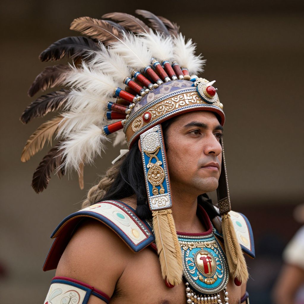 Man Aztec Warrior Costume, a close up of a person in a costume with a feather headdress