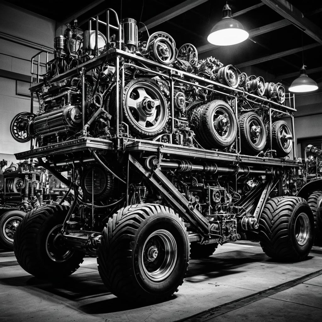 Black and white hyper-realistic image of a large, multi-tiered chromed machine featuring various tires and intricate mechanical parts, illuminated by overhead industrial lighting inside a workshop.
