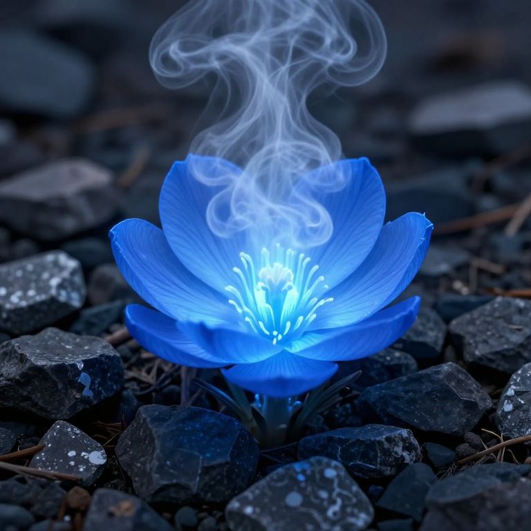 Photograph of a glowing blue flower with smoke-like wisps, surrounded by dark, wet rocks, creating a mystical, ethereal effect.