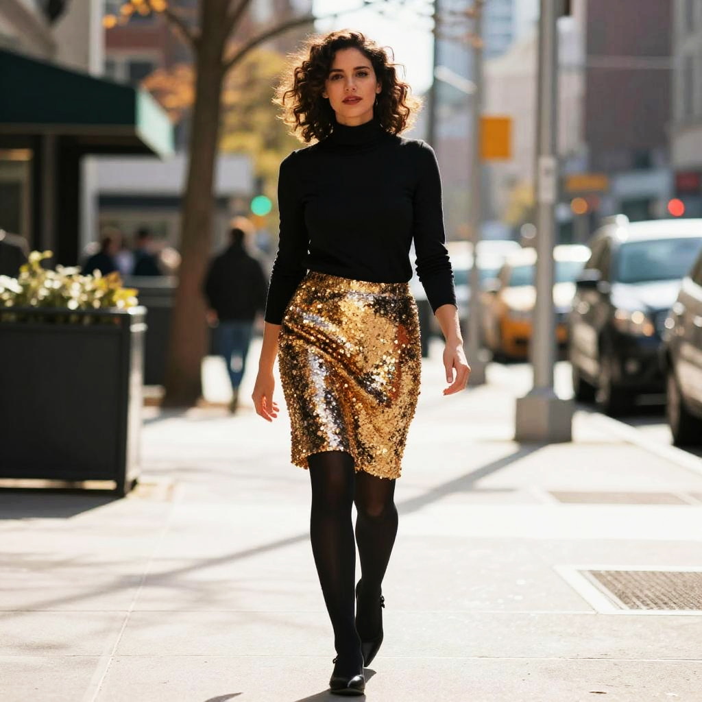 Photograph of a confident woman walking down a sunlit city sidewalk. She has curly dark brown hair, fair skin, and is wearing a black long-sleeve turtleneck, shiny gold sequin skirt, black tights, and black shoes. The background shows blurred city buildings, trees with autumn leaves, and a few pedestrians. The sunlight creates a bright, contrasty effect on her outfit and the street.