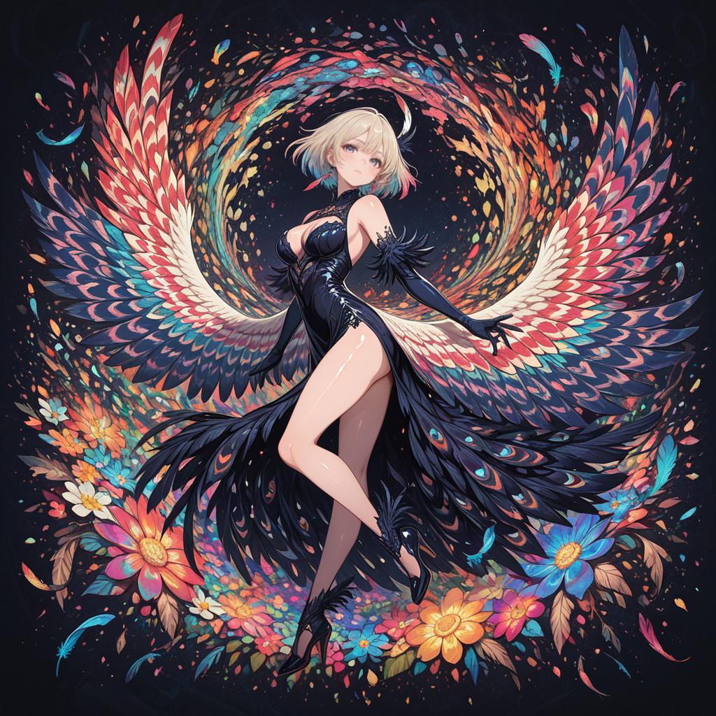 (masterpiece, top quality, best quality, official art, beautiful and aesthetic:1.2), (1girl:1.3), extremely detailed, (fractal art:1.1), (colorful:1.1)(flowers:1.3), highest detailed, (zentangle:1.2), full body, (abstract background:1.3), (shiny skin), (many colors:1.4), (earrings), (feathers:1.5)