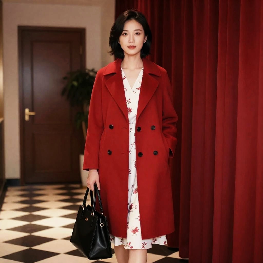 Nighttime photograph of an Asian woman with short dark hair, wearing a light gray trench coat, standing on a wet street. She holds a black bag in her right hand. A blue bus with illuminated interior and yellow handrails is in the background. The bus is slightly blurred, emphasizing motion. The woman's expression is neutral. The street reflects the bus's lights.