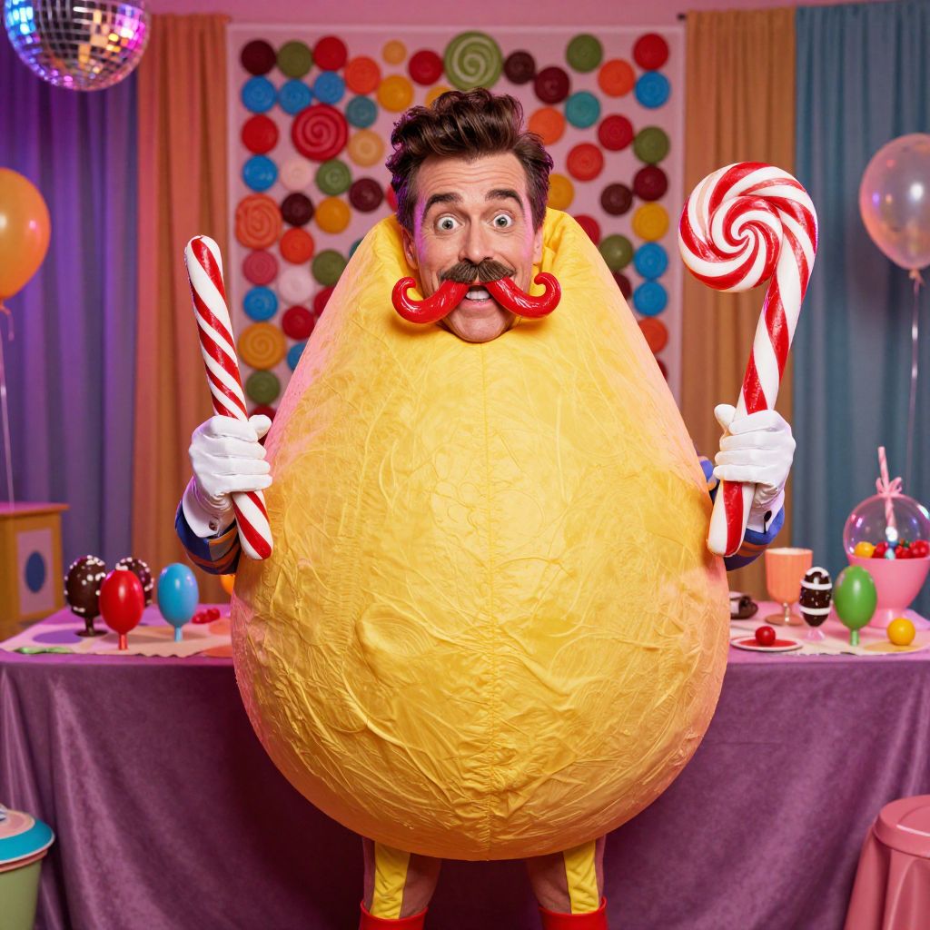 Photograph of a man with a mustache, wearing a bright yellow, textured, balloon-like costume, white gloves, and yellow pants. He holds two large, red and white peppermint candy canes. The background features colorful, circular decorations, pink and blue curtains, and a table with balloons, a skull cupcake, and festive items. A disco ball hangs from the ceiling, adding a playful, party atmosphere. The man's expression is wide-eyed and surprised. The image is brightly lit and highly saturated, emphasizing the vibrant colors and whimsical theme.
