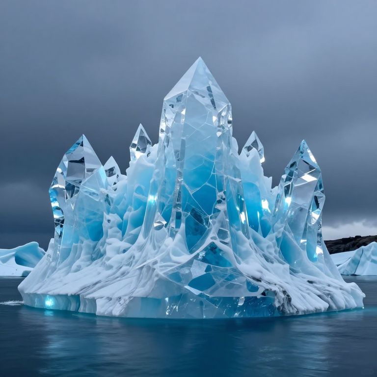 Photograph of a majestic iceberg formation floating in a dark, stormy ocean. The iceberg is composed of numerous transparent, jagged crystal shards, glowing with ethereal blue and white light from within. The surface of the iceberg is smooth and reflective, with intricate, angular shapes. The background features a cloudy, overcast sky, adding a dramatic contrast to the bright, crystalline structure. The water around the iceberg is calm and dark, enhancing the icy blue tones of the crystals. The image captures the natural beauty and complexity of the iceberg against a moody, atmospheric seascape.