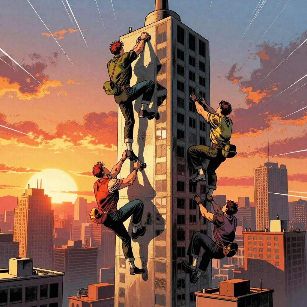 Digital comic-style illustration of four men climbing a skyscraper at sunset, with vibrant orange and purple sky, cityscape background, and dynamic action lines.