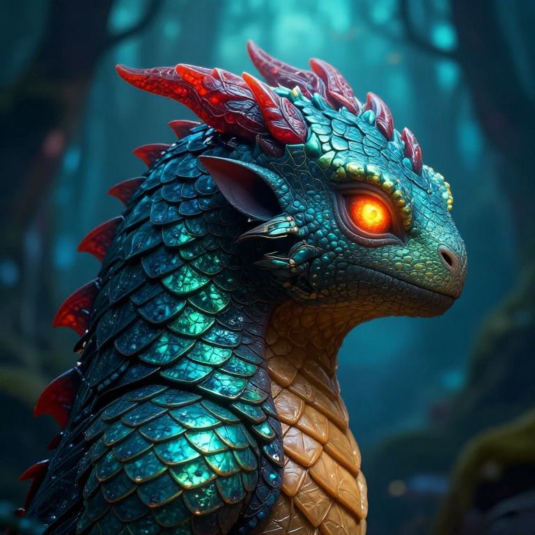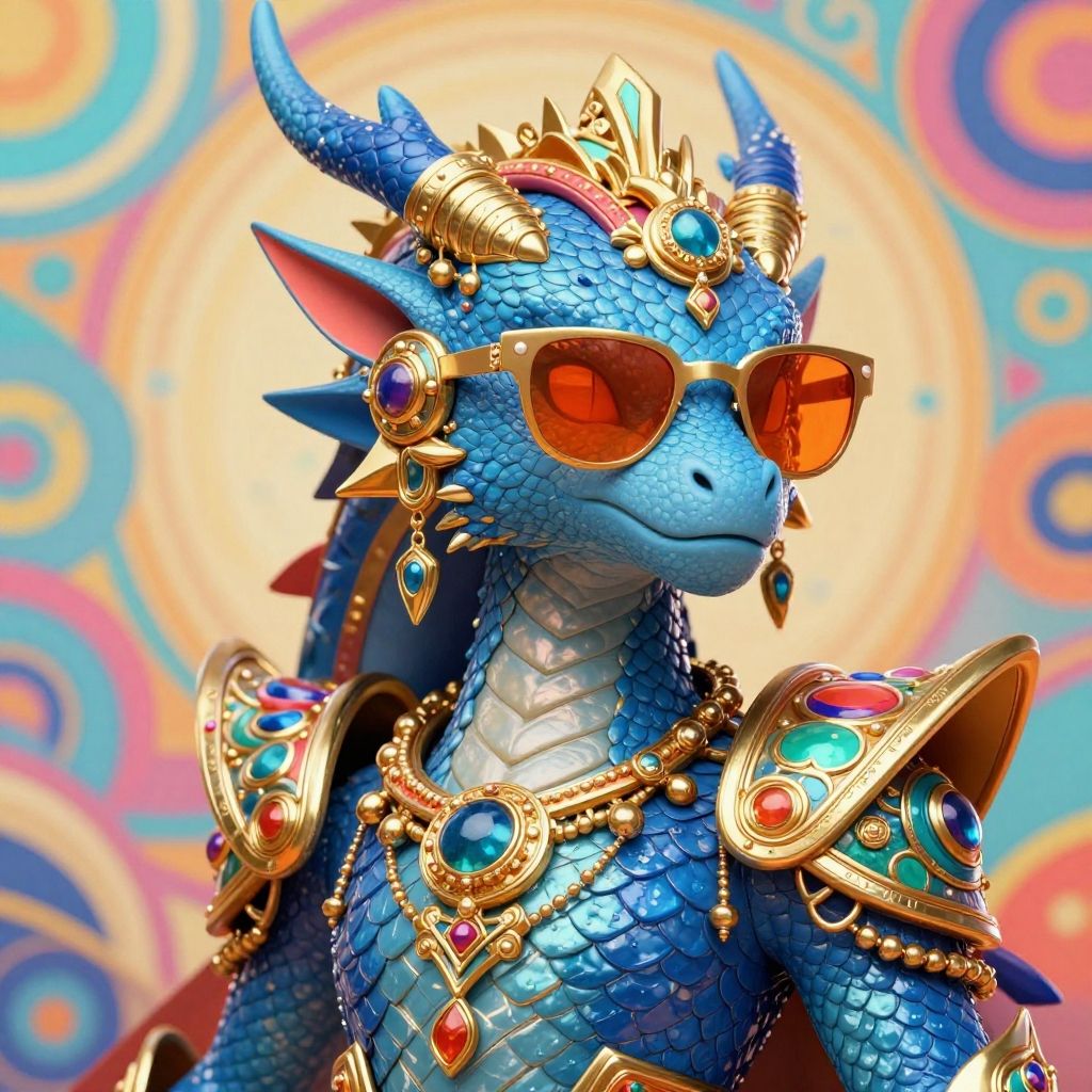 Highly detailed digital artwork of a futuristic blue dragon-like alien figure adorned with intricate golden and colorful armor. The creature wears reflective orange sunglasses and has textured scales, elaborate headgear with spiked blue elements, and ornate jewelry. The background features vibrant, abstract patterns complementing the character's elaborate design.