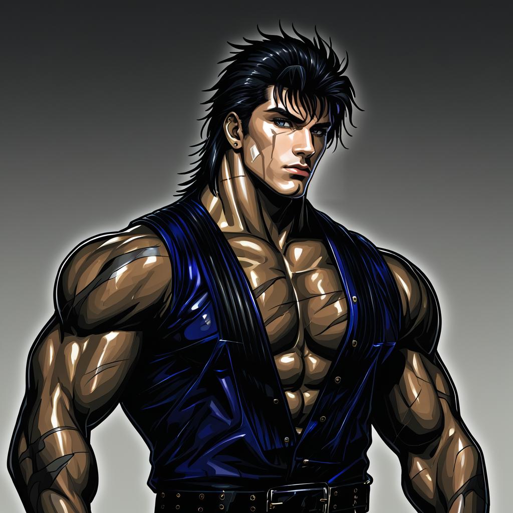 Kenshiro, hokuto no ken, 1boy, black hair, scar, muscular, manly, muscular male, by artist airisubaka, anime