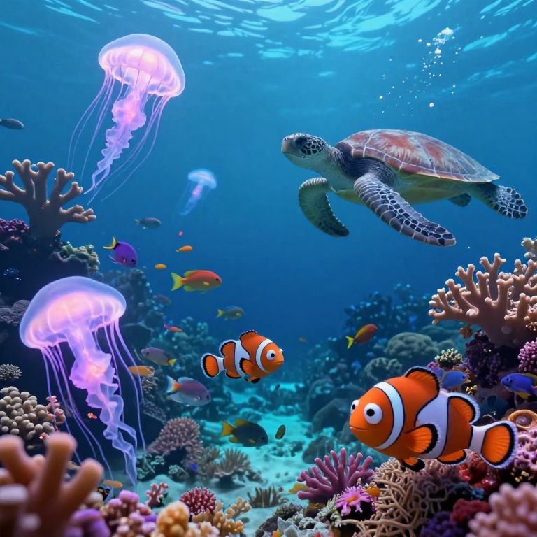 Envision an enchanting underwater tableau where luminescent jellyfish in vivid hues, akin to Kandinsky's abstract compositions, glide gracefully through an illuminated coral garden. A curious sea creature, adorned with intricate markings reminiscent of traditional Japanese designs, explores this surreal aquatic realm from a unique perspective, capturing the harmonious fusion of organic and artistic elements. This image conveys both serenity and curiosity as the creature navigates the mysterious depths where beauty and enigma intertwine in a captivating ballet of light and color.