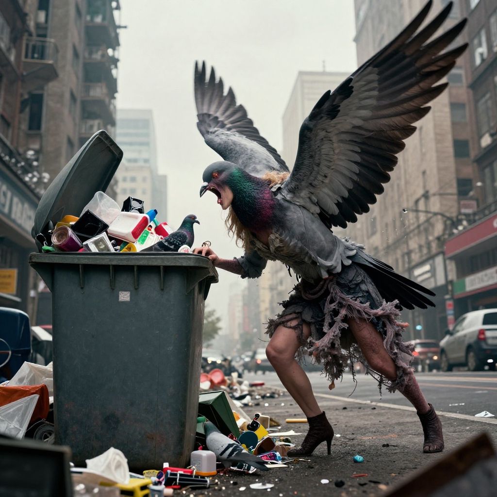 Deep and vibrant cinematic photo, (The WerePigeon!), She was bitten by a pigeon near a toxic trash bin and now undergoes a horrible transformation into a part-human-part-pigeon creature at the sight of a full waste bin! Part human and part pigeon, seeing a full garbage bin transforms her into the WerePigeon! Outdoors, urban, mixed planes of existence/ merging realities/ blended dimensions. :((breathtaking surrealism, exquisitely detailed, experimental angles, lit from below, expansive, highest quality photo, epic realism, Getty Images, ultrarealistic))