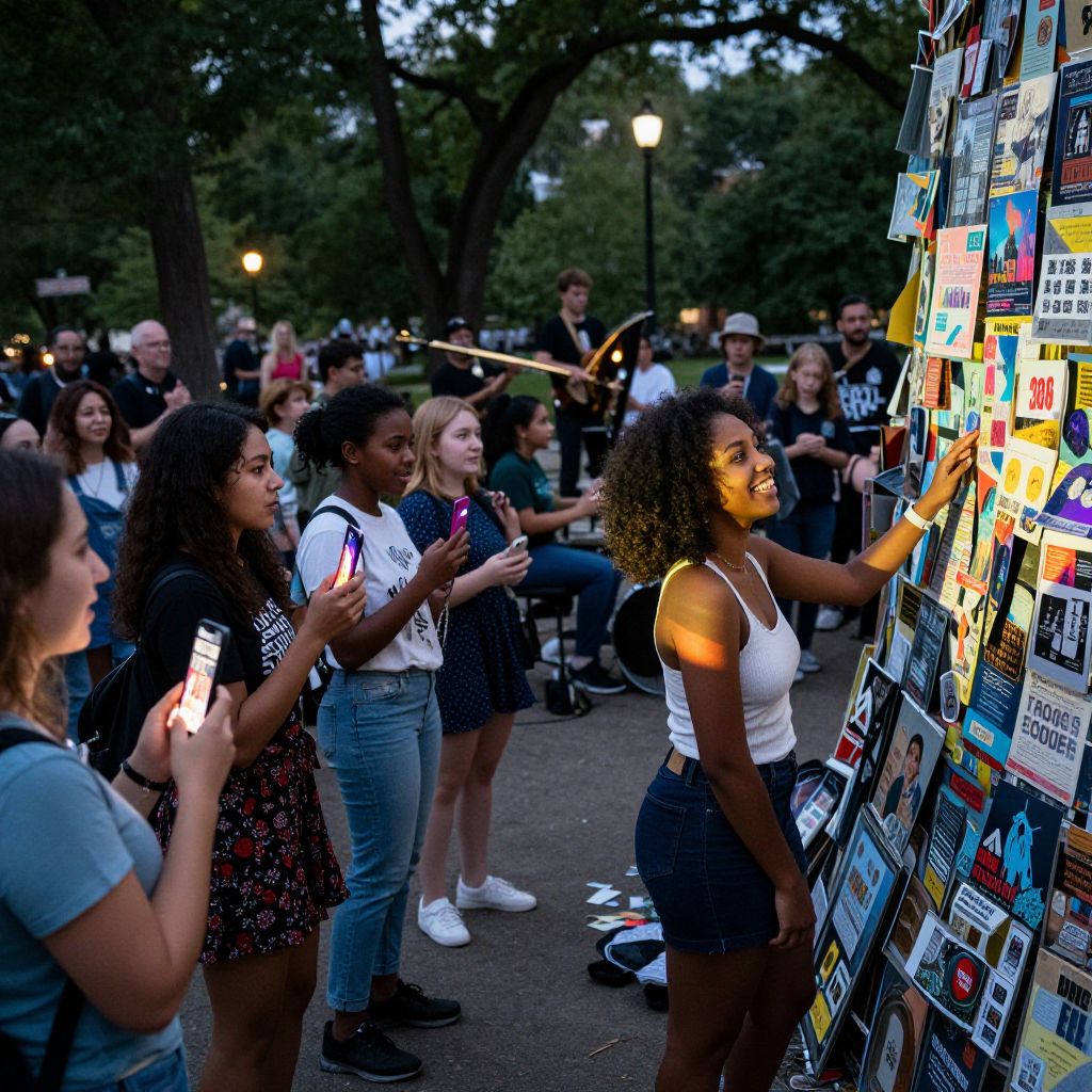 A lively urban event unfolds in a central park at evening hour, with attendees wearing city-themed clothing and holding illuminated phone displays; a young woman with curly black hair and a warm brown complexion stands beside a community art installation made of recycled metal and light projections, laughing with friends as the crowd gathers around a live jazz band.