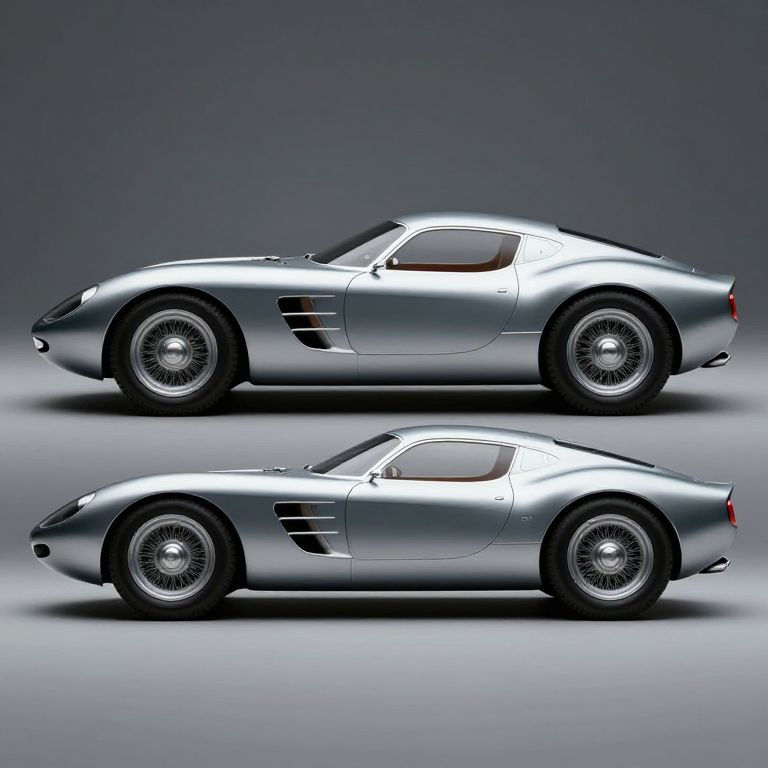 Photorealistic CGI of a sleek, silver, classic sports car with wire-spoke wheels, shown in side profile twice, against a gradient gray background